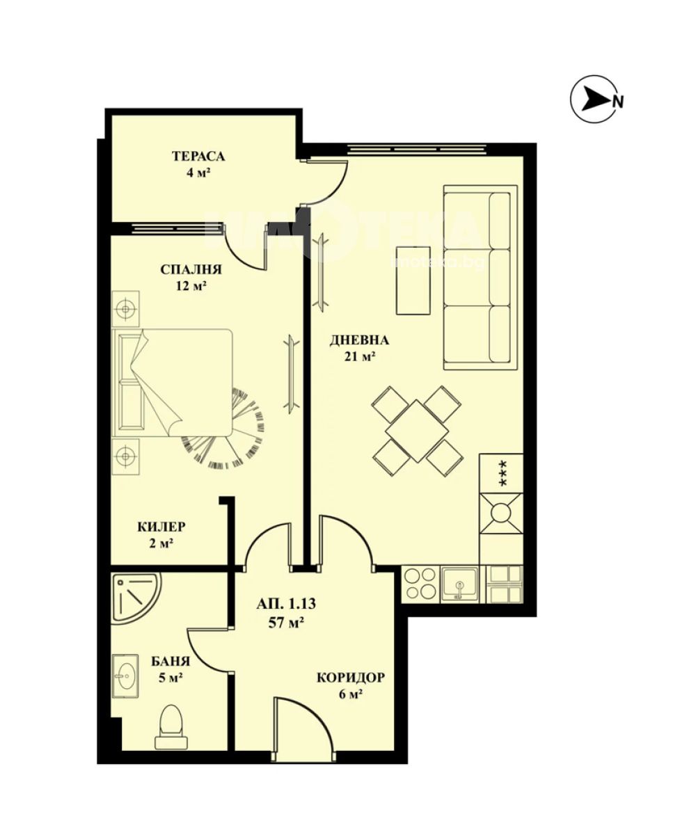 Двустаен апартамент, състоящ се от: антре, дневна с кухненски бокс, спалня и балкон. Изложението е източно.