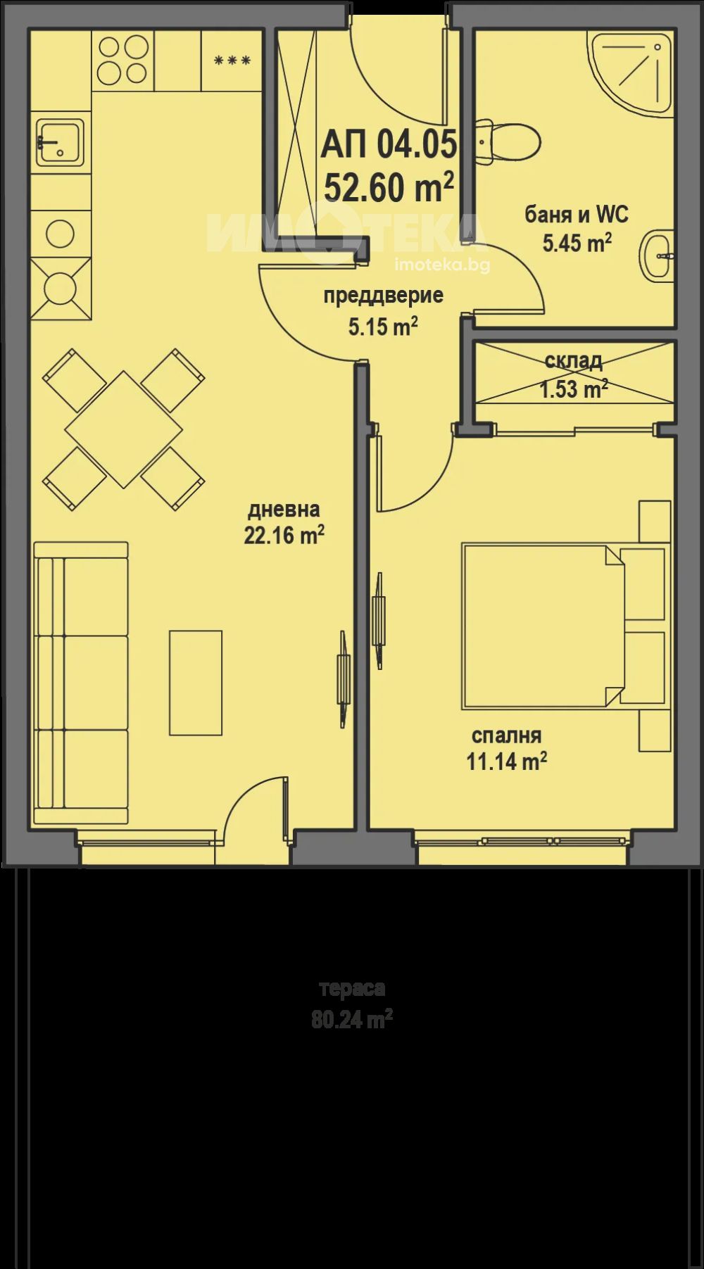 Предлагаме Ви двустаен апартамент с прилежащ двор 80 кв.м. Разпределен е по следният начин: коридор, дневна с кухненски бокс, спалня с дрешник, баня с тоалетна и двор. Възможност за покупка на подземен гараж.