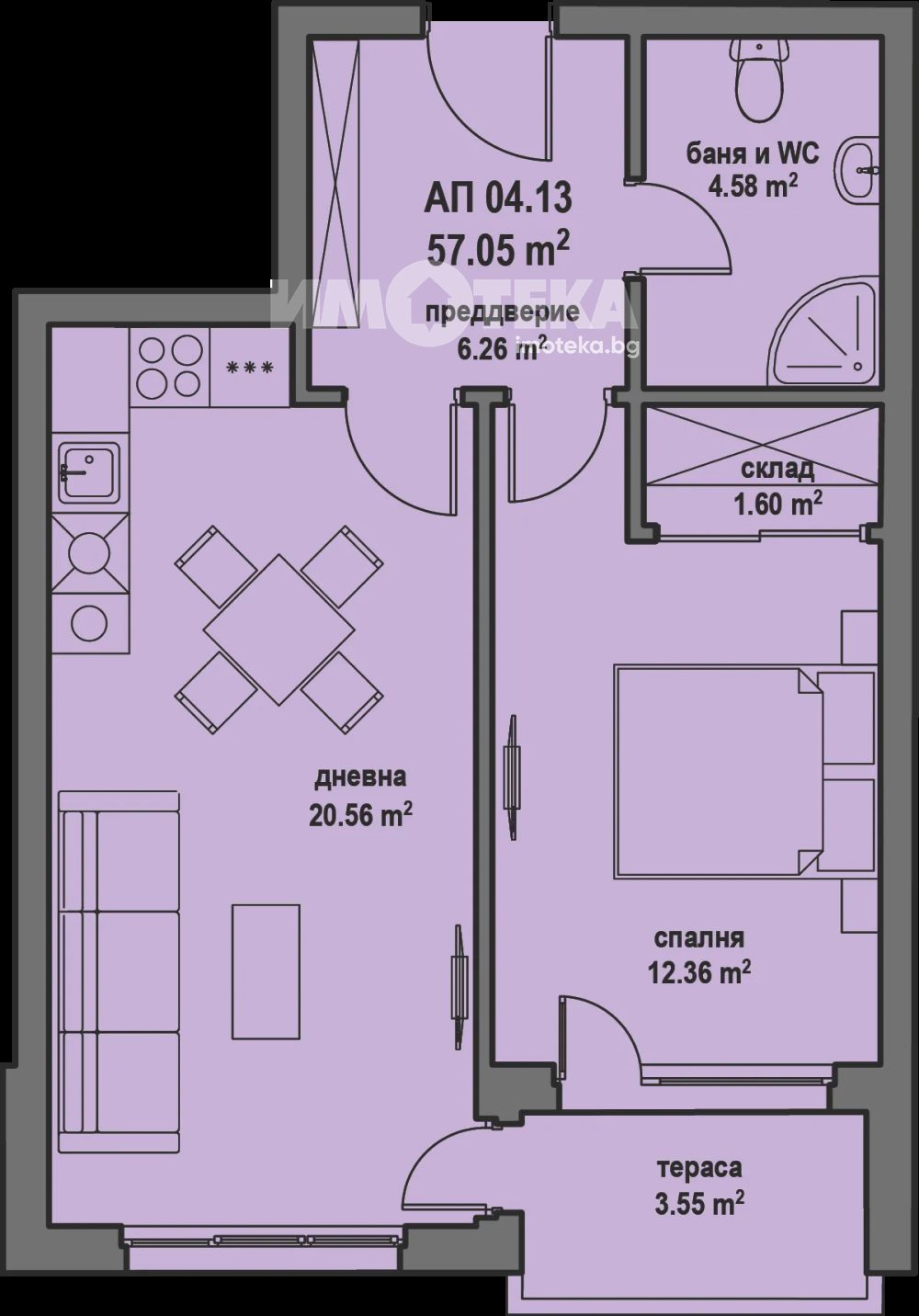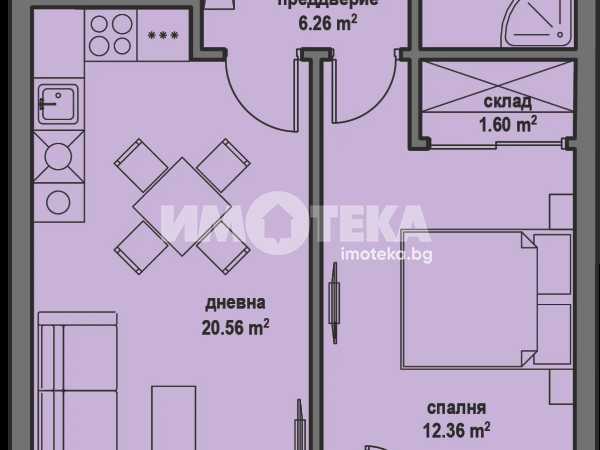 Предлагаме Ви двустаен апартамент в затворен комплекс. Разпределен е по следният начин: коридор, дневна с кухненски бокс, спалня с дрешник, баня с тоалетна и тераса.