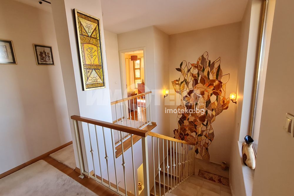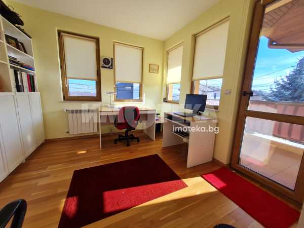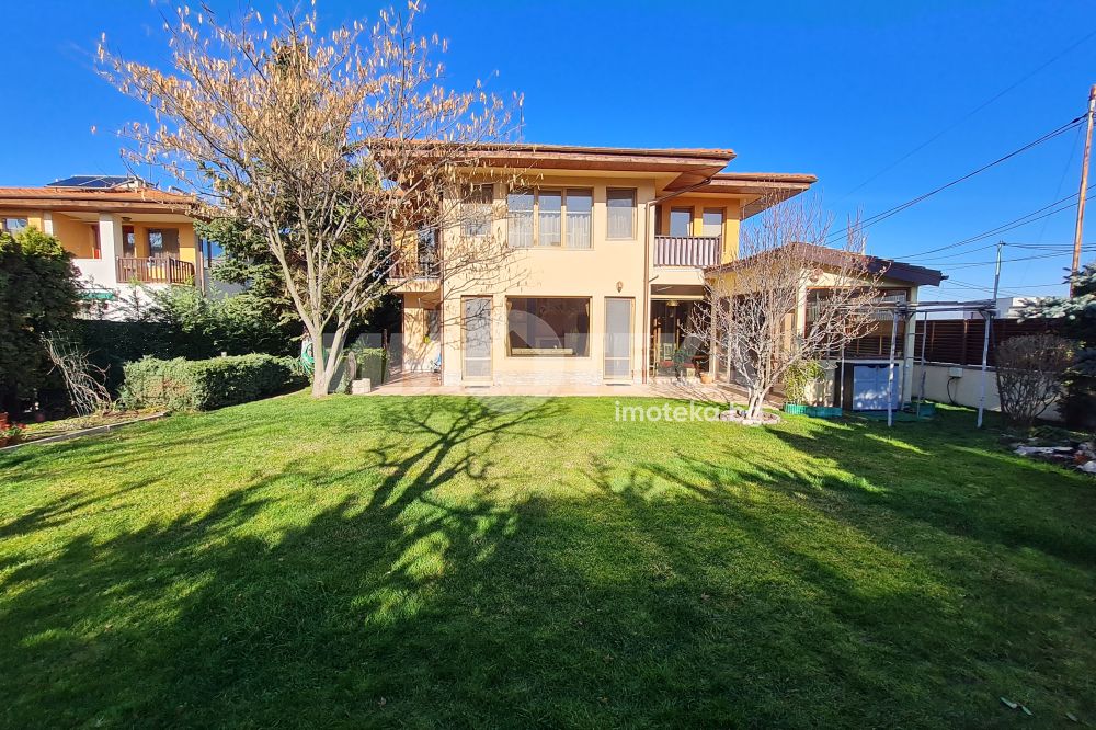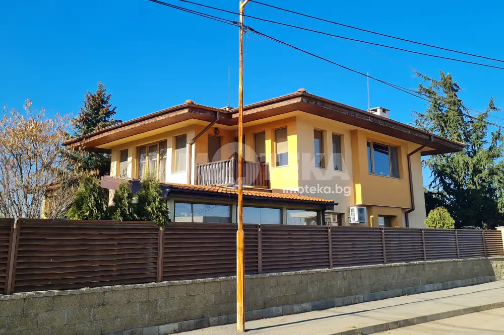 Уникален семеен имот, направен с много мисъл, качество и стил и оборудван с всички съвременни технологии и удобства. На два етажа с площ по 150 кв.м. или с обща площ от 300 кв.м. в които са разположени: четири стаи със самостоятелни бани с тоалетна, работен кабинет, дневна, кухня, мокро помещение, складово /отоплително/ помещение, двоен гараж 35 кв.м., две малки и една голяма тераси. Отделно от тази площ има и остъклена с PVC дограма лятна кухня, както и складова постройка в задния двор на имота. Парцел с площ от 600 кв.м., равен с правоъгълна форма и безупречна поддръжка.