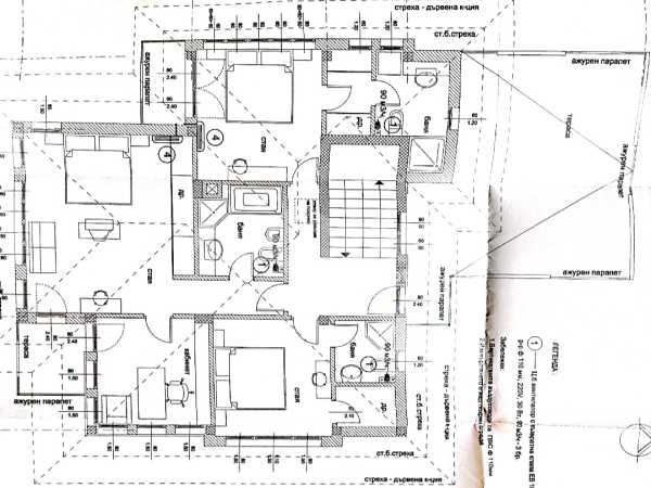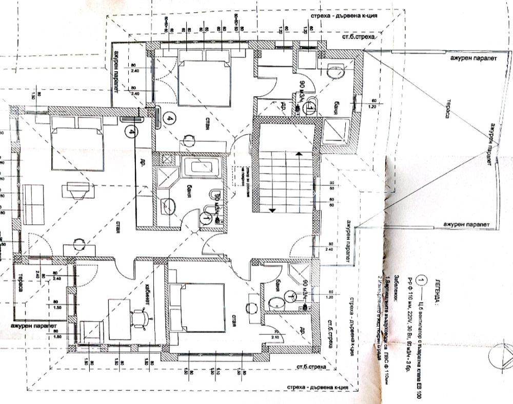 Масивна тухлена сграда със стоманобетонни плочи и колони. С разпределение: 1ви етаж ( партер ) - антре, дневна, кухня, спалня, баня с тоалетна, мокро помещение, складово /отоплително/ помещение, лятна кухня и двоен гараж 35 кв.м. 2ри етаж - три спални със самостоятелни бани и тоалетна, работен кабинет, две малки тераси и една голяма тераса с площ от 35кв.м.