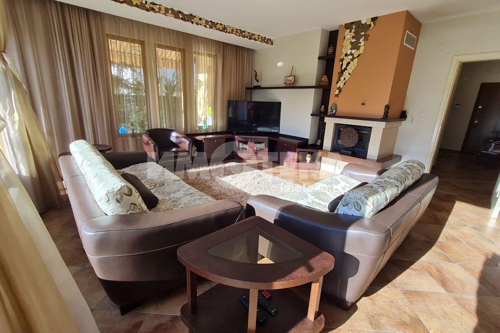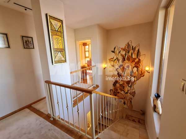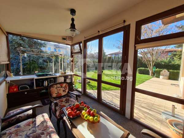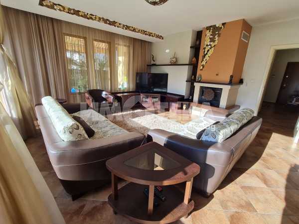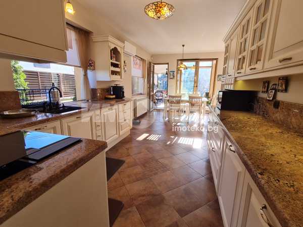 В къщата: 1. Отоплителна с-ма с радиатори и подово отопление на партера и радиатори на втория етаж. 2. Отопление с газов котел, ел. котел, камина с водна риза за цялата къща на дърва и климатици. 3. Ел. бойлер (300л.) с подгряване на водата от слънчеви колектори, ток или от камината чрез серпентина. 4. Централно газоснабдяване, вода и канализация. 5. СОТ - Алармена охранителна с-ма. 6. Дефектнотокова инсталация. 7. Седем камерна дограма REHAU ( цвят - Воден дъб "лимитирана серия" ). Всички прозорци и врати са с комарници и щори. 8. Полилеи Tiffany и декорация по дизайнерски проект. 9. Комбинирани котлони за готвене - два индукционни и два на газ, миялна, пералня със сушилня, два хладилника и т.н. 10. Подови настилки: 1ви етаж ( гранитогрес ), 2ри етаж ( паркет ).