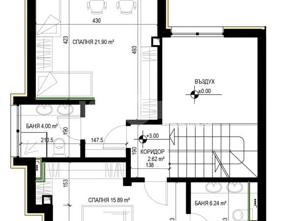 "Ниво 3" включва две просторни спални със собствени бани с wc, възможност за обособяване на трета спалня