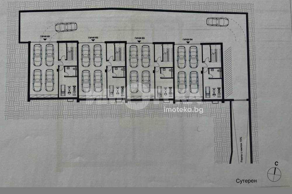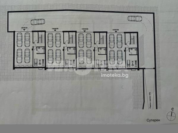 Сутерен: гараж за 4 коли, коридор, фитнес, санитарно помещение, скалдово помещение.
