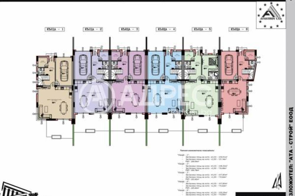 Към всяка къща са предвидени гараж и паркомясто. Къщите са проектирани с Южни дворове!!!