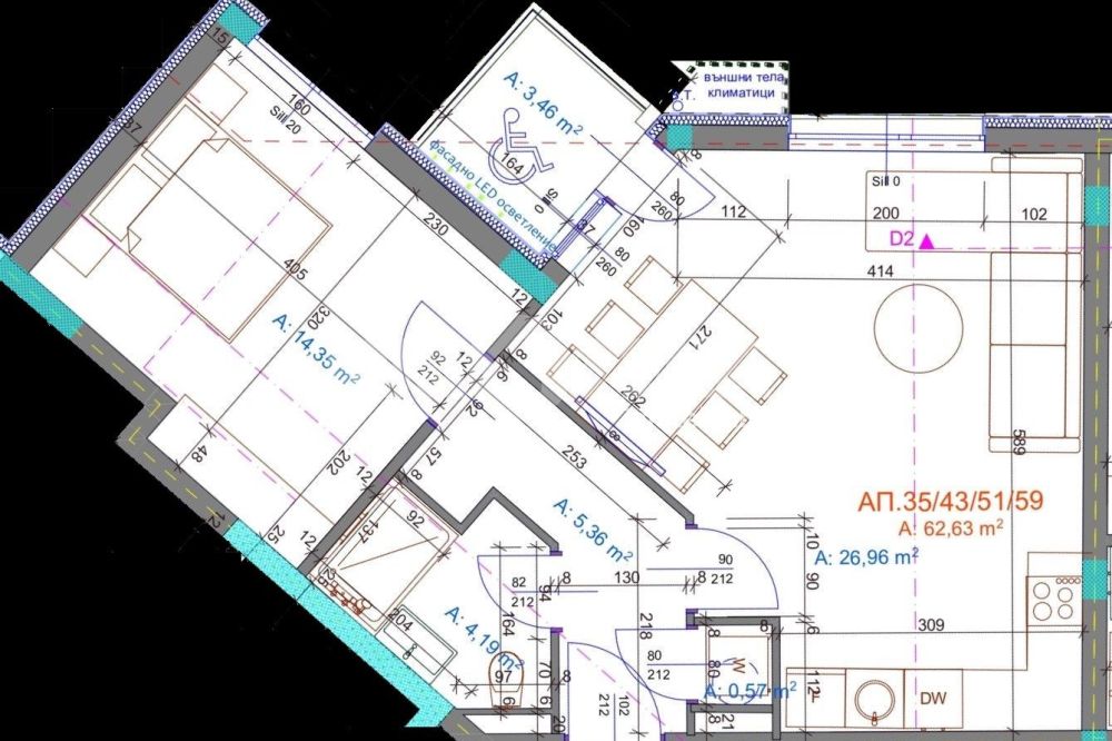 Апартамента се състои от: входно антре, хол с кухненски бокс, спалня, баня с тоалетна, мокро помещение или втора тоалетна и тераса.