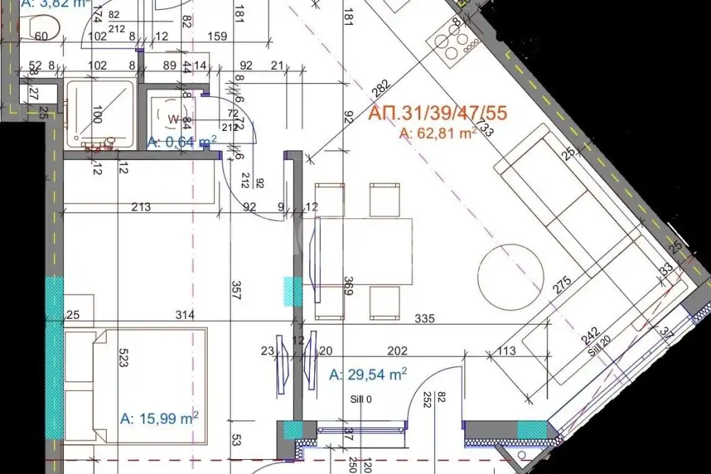Апартамента се състои от: входно антре, хол с кухненски бокс, спалня, баня с тоалетна, мокро помещение или втора тоалетна и тераса.