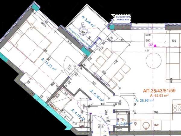 Апартамента се състои от: входно антре, хол с кухненски бокс, спалня, баня с тоалетна, мокро помещение или втора тоалетна и тераса.