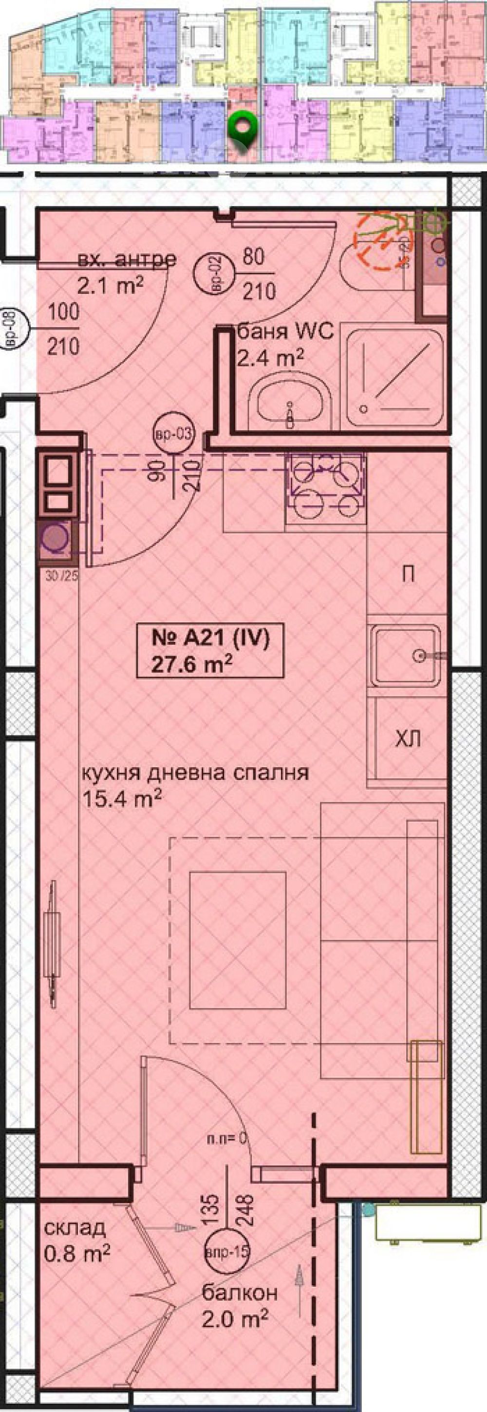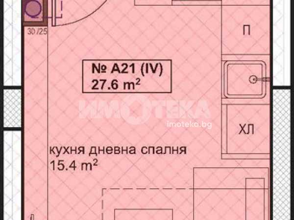 Апартаментът е със следното разпределение: входно антре, едно общо помещение с обозначени кухненски бокс, трапезария и мека мебел, баня с тоалетна и тераса.