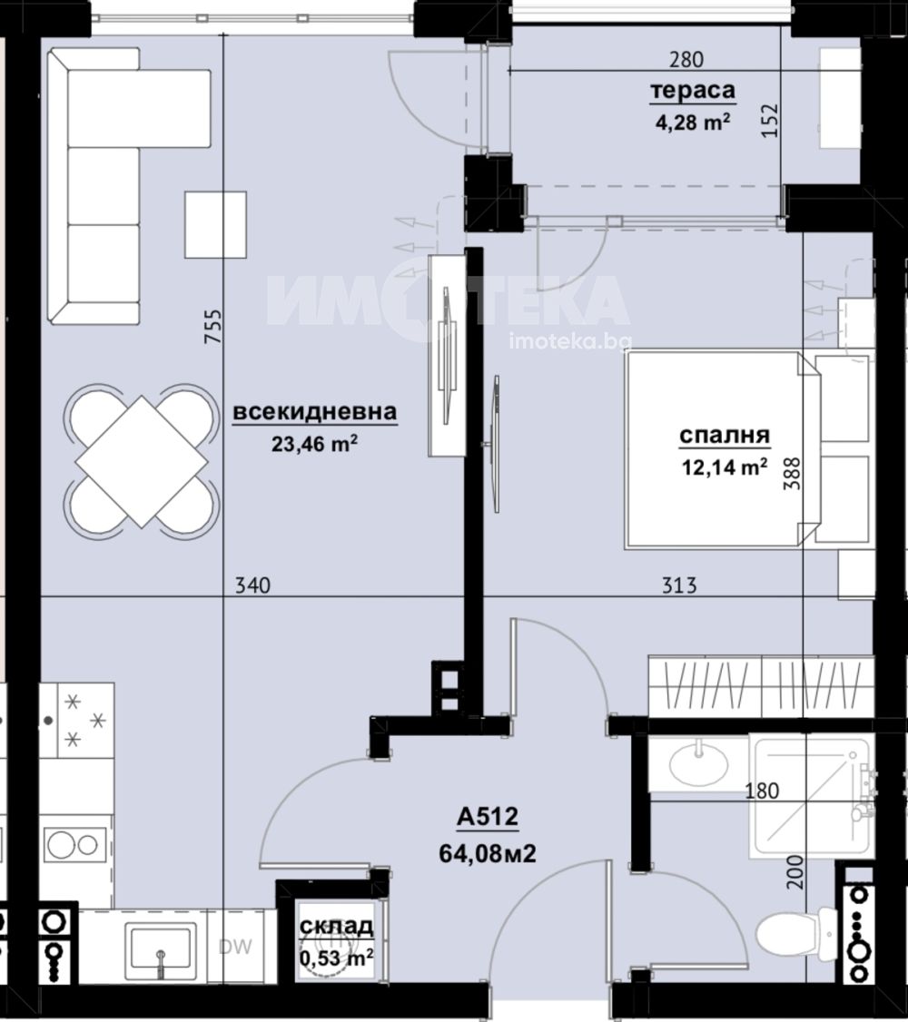 Имотът е с пллощ 64.08 кв. м., етаж 5 от 9, асансьор.