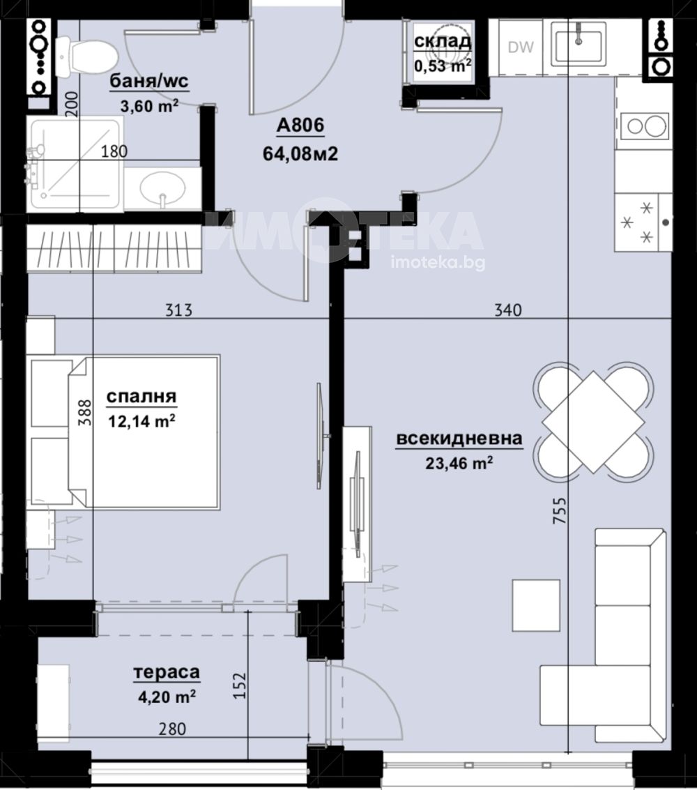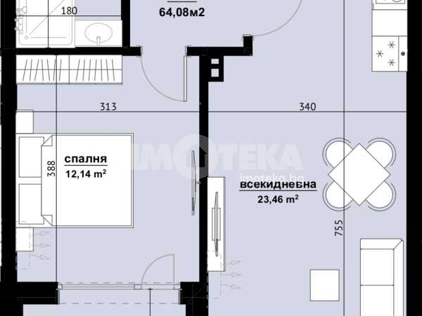 Имотът е с пллощ 64.08 кв. м., етаж 8 от 9, асансьор.