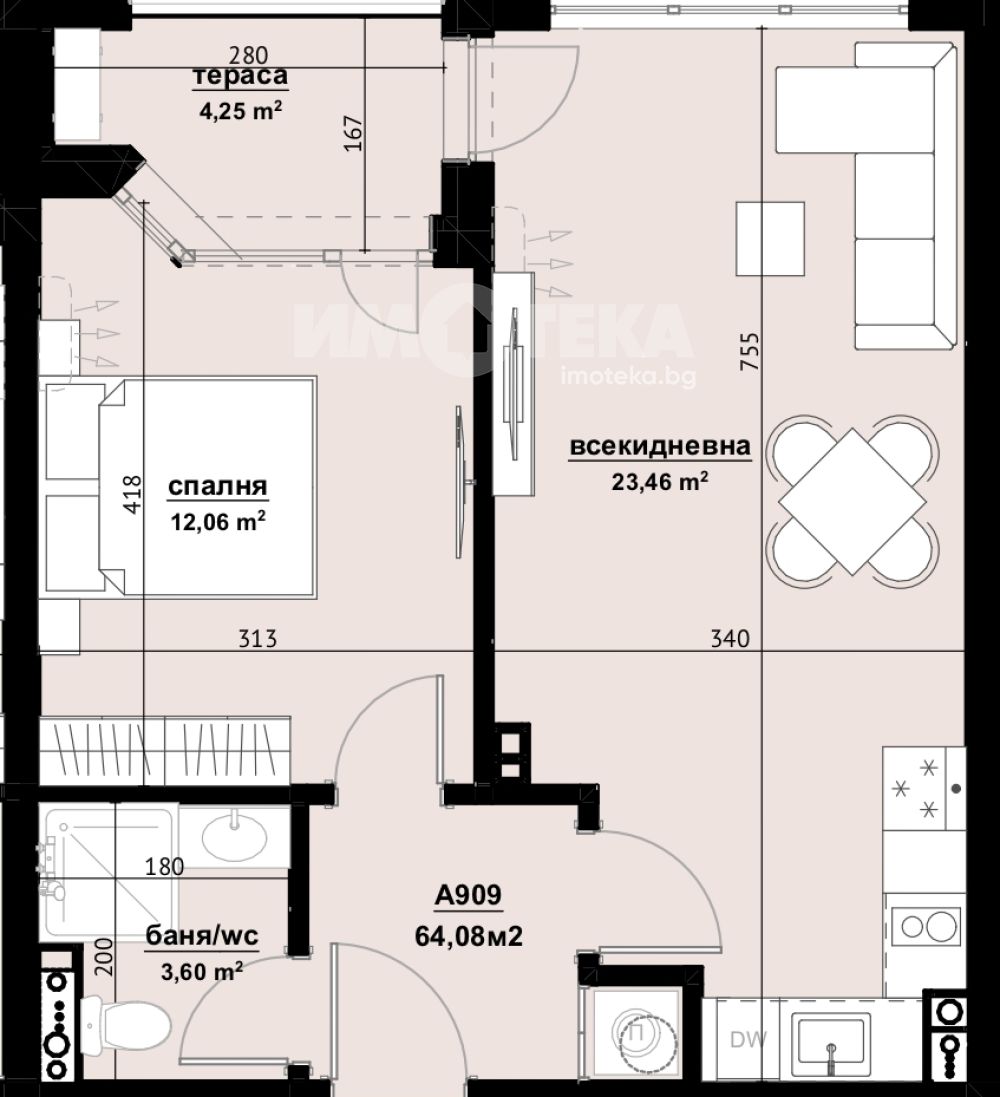 Имотът е с пллощ 64.08 кв. м., етаж 9 от 9, асансьор.