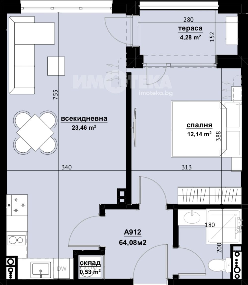 Имотът е с пллощ 64.08 кв. м., етаж 9 от 9, асансьор.