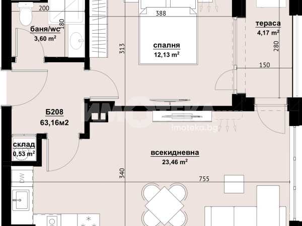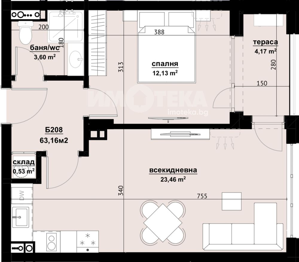 Имотът е с пллощ 63.16 кв. м., етаж 2 от 9, асансьор.
