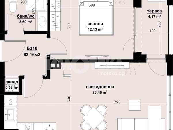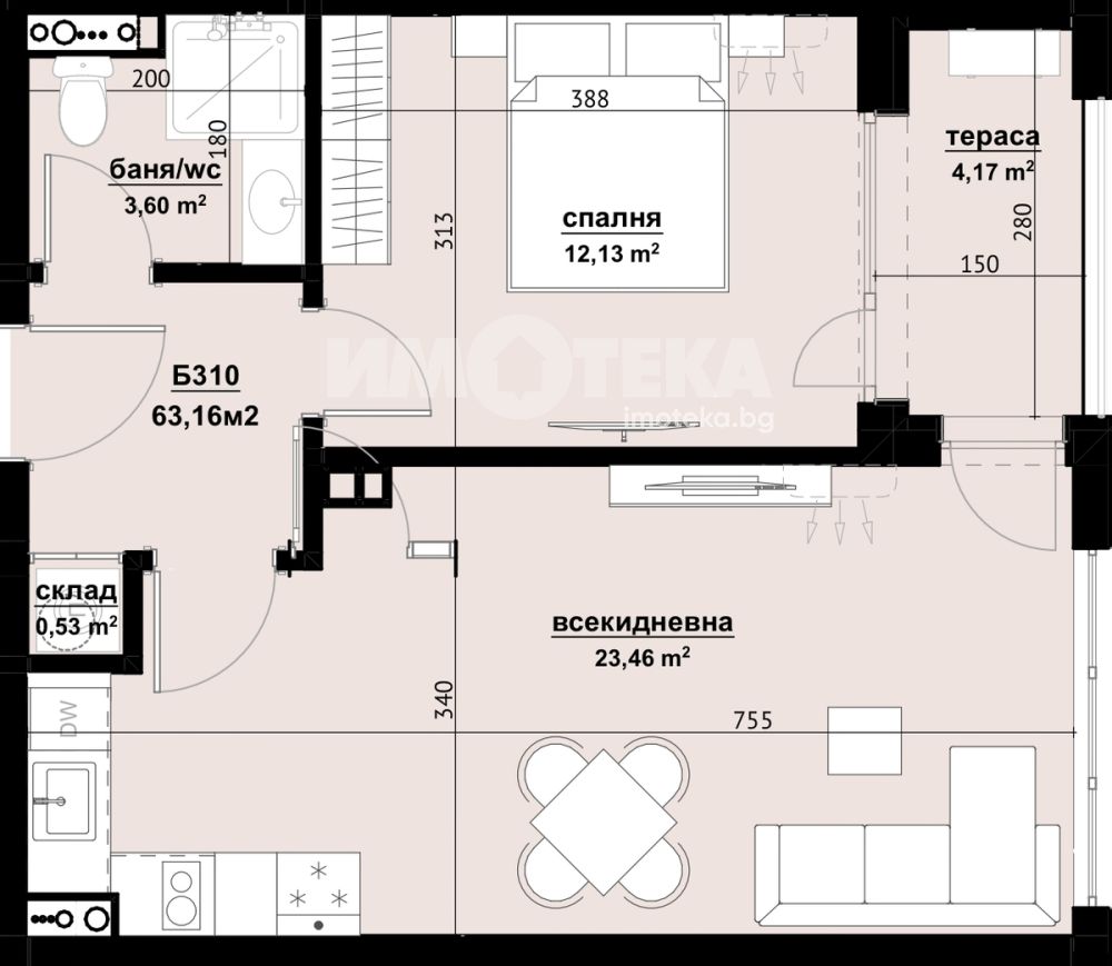 Имотът е с пллощ 63.16 кв. м., етаж 2 от 9, асансьор.