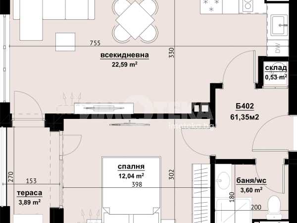 Имотът е с пллощ 63.16 кв. м., етаж 4 от 9, асансьор.