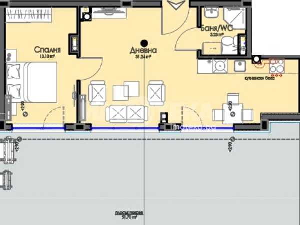 Площ на имота 115,09 кв. м., етаж 9 от 9, асансьор. Разпределение: дневна с кухненски кът и спалня с обща тераса, баня с тоалетна. Апартаментът ще бъде завършен "на тапа''. Към всеки имот може да бъде закупен ГАРАЖ от 26 000 до 38 000 евро.