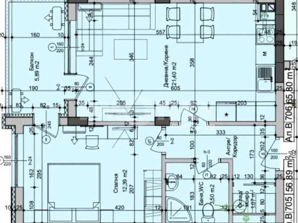 Двустаен апартамент с площ от 65,36 кв.м., на седми жилищен етаж със следното разпределение. Дневна с кухненски кът, спалня, баня с WC, мокро помещение/склад и тераса. Изложение югозапад.