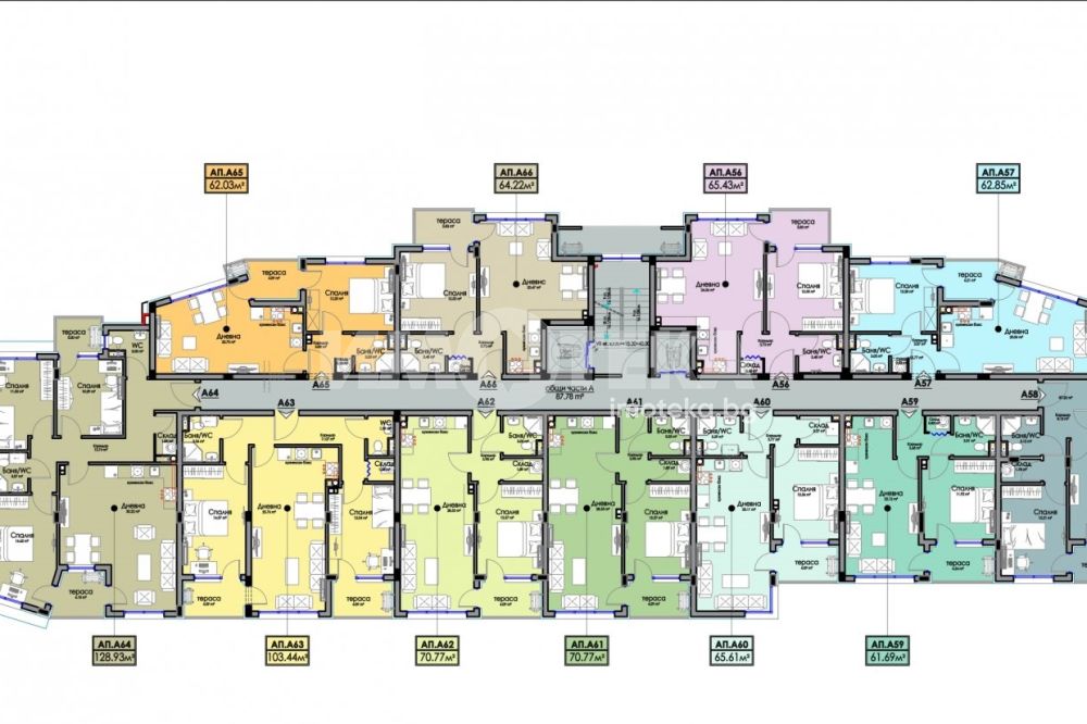 Площ на имота 128,93 кв. м., етаж 7 от 9, асансьор. Разпределение: дневна с кухненски кът и спалня с общ балкон, втора спални, трета спалня с балкон, две бани с тоалетни и складово помещение. Апартаментът ще бъде завършен "на тапа''. Към всеки имот може да бъде закупен ГАРАЖ от 26 000 до 38 000 евро.