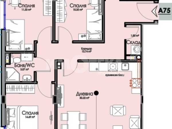 Площ на имота 128,08 кв. м., етаж 8 от 9, асансьор. Разпределение: дневна с кухненски кът и спалня с общ балкон, втора спални, трета спалня с балкон, две бани с тоалетни и складово помещение. Апартаментът ще бъде завършен "на тапа''. Към всеки имот може да бъде закупен ГАРАЖ от 26 000 до 38 000 евро.