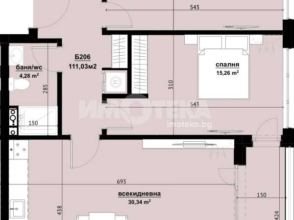 Тристаен тухлен апартамент,с площ от 111.03 кв.м , състои се от две спални помещения, всекидневна с трапезария и кухня, две бани + WC,дрешник ,коридор и два балкона .