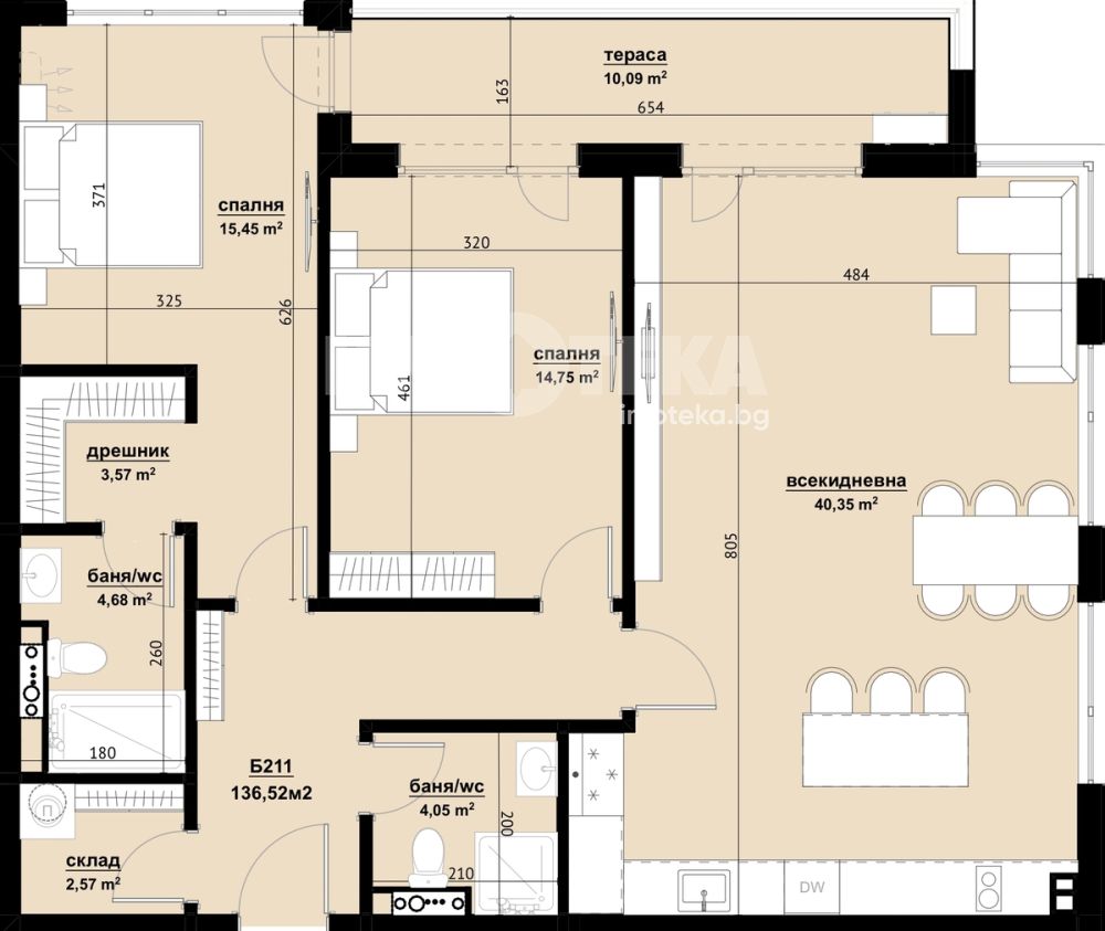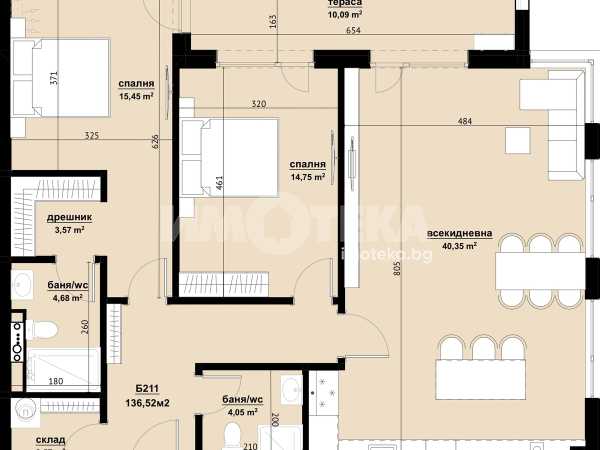 Тристаен тухлен апартамент,с площ от 135.52 кв.м , състои се от две спални помещения, всекидневна с трапезария и кухня, две бани + WC,дрешник ,коридор и два балкона .