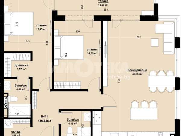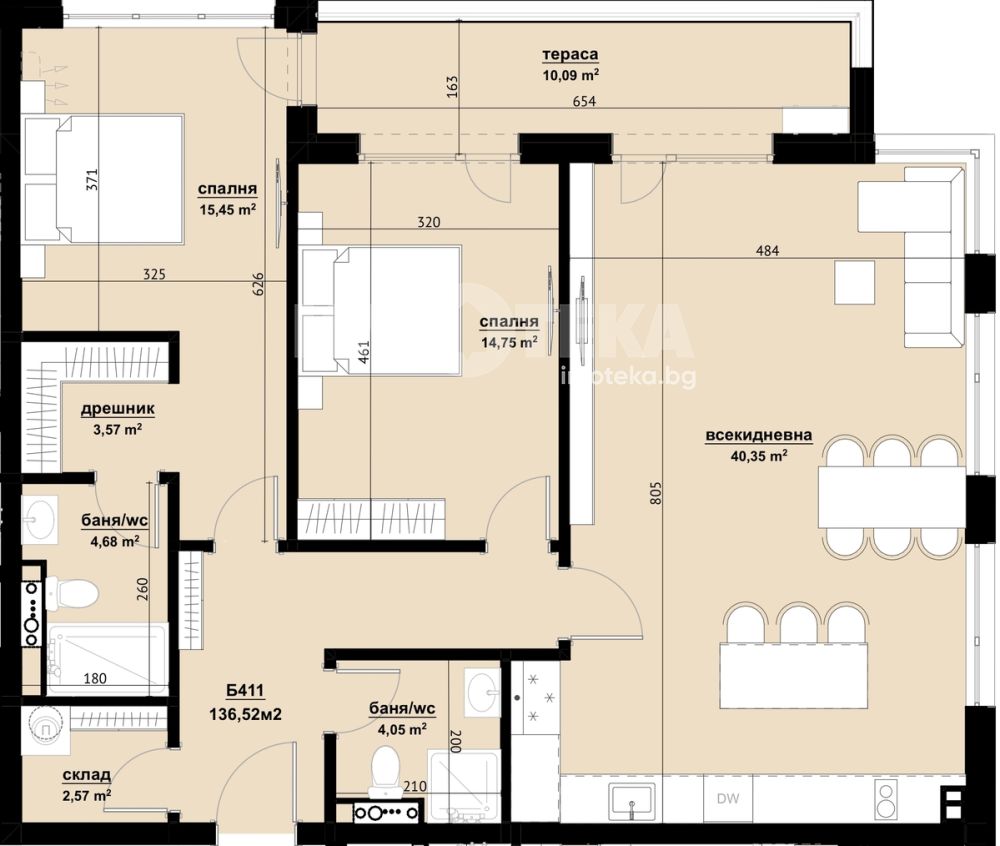 Тристаен тухлен апартамент,с площ от 136.52 кв.м , състои се от две спални помещения, всекидневна с трапезария и кухня, две бани + WC,дрешник ,коридор и два балкона .