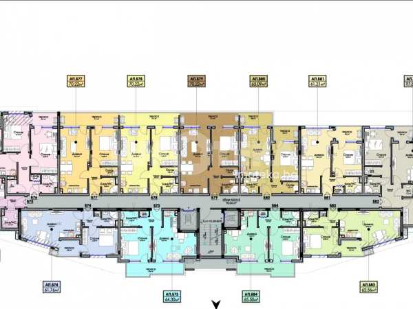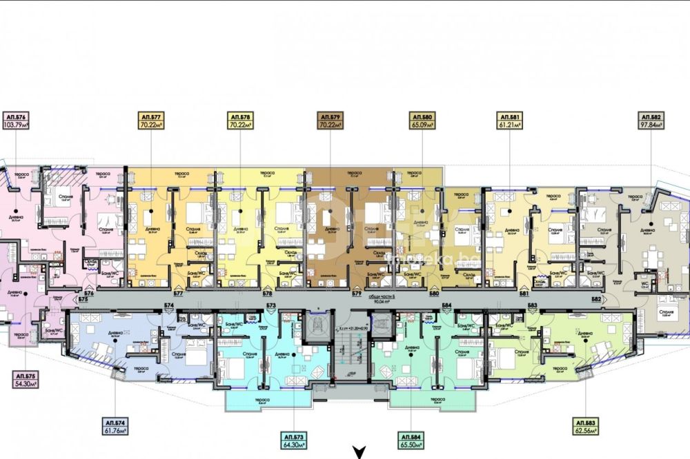 Площ на имота 97,84 кв. м., етаж 8 от 9, асансьор. Разпределение: дневна с кухненски кът и спалня с обща тераса, втора спалня, баня с тоалетна и отделно тоалетна и складово помещение. Апартаментът ще бъде завършен "на тапа''. Към всеки имот може да бъде закупен ГАРАЖ от 26 000 до 38 000 евро.