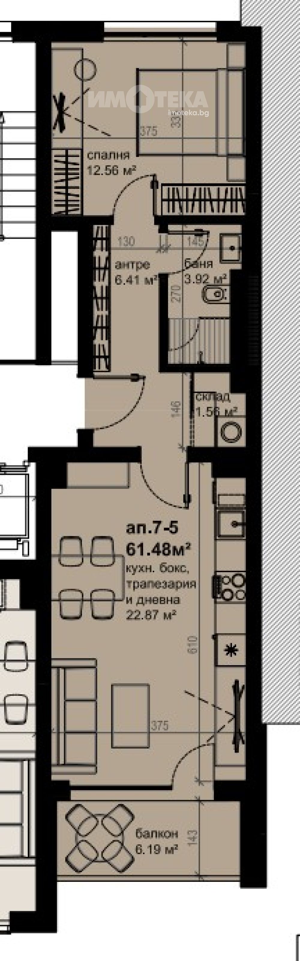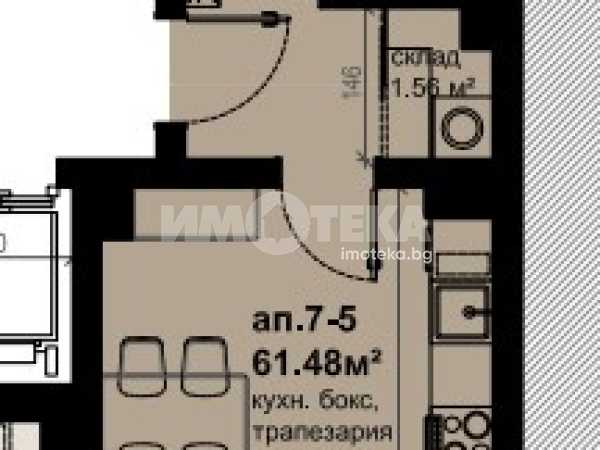 Жилището се състои се от входно антре, всекидневна с кухненски кът и трапезария, една спалня, баня с тоалетна, склад/мокро помещение и тераса.