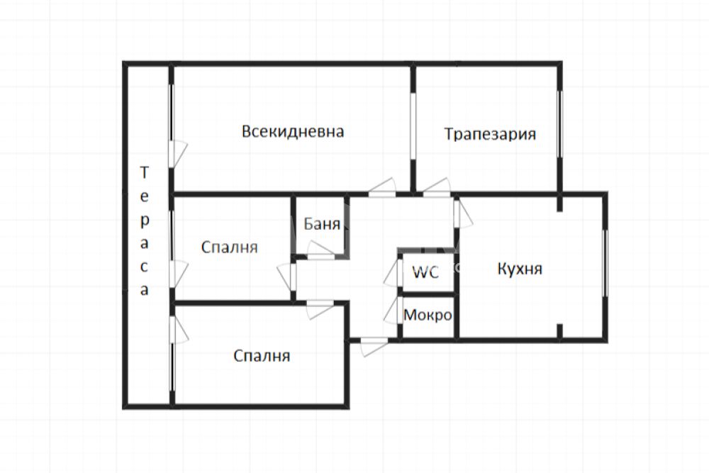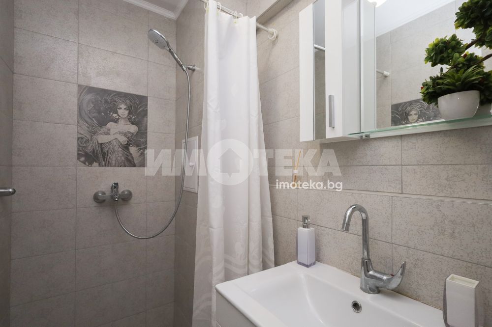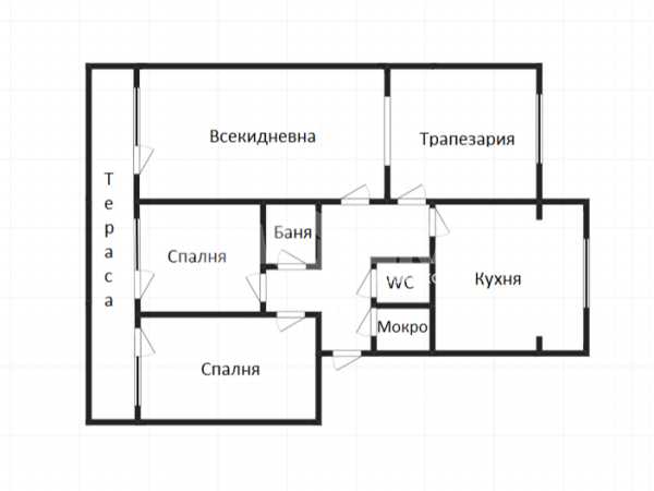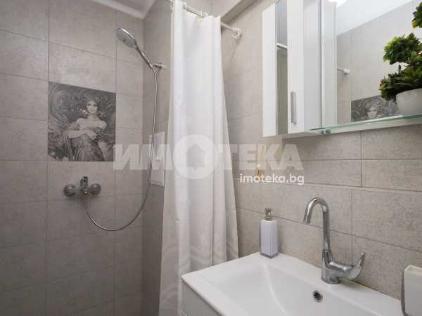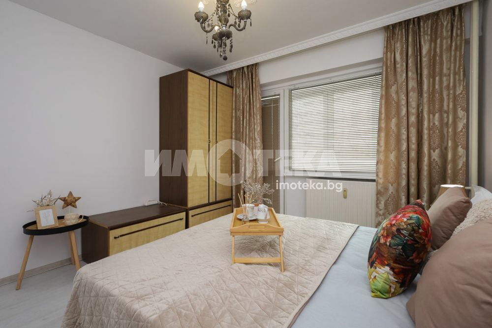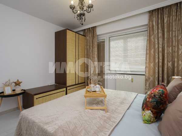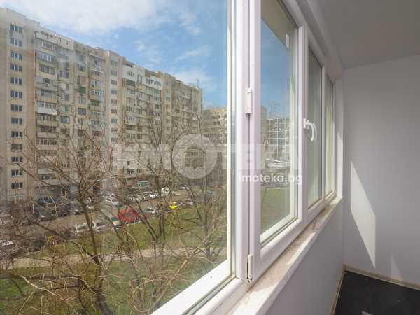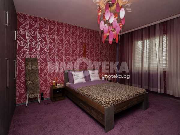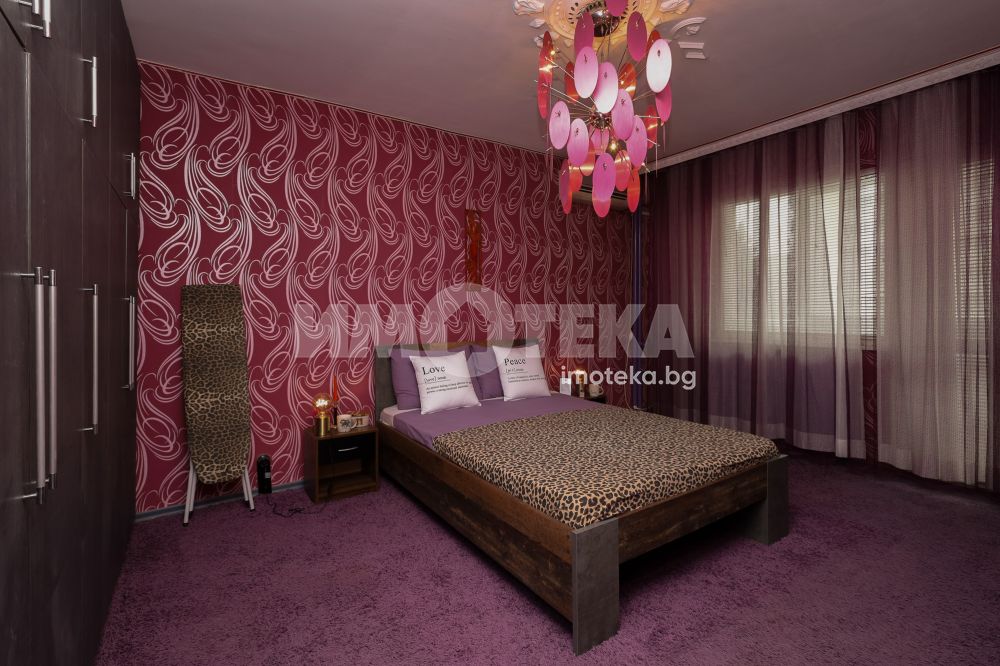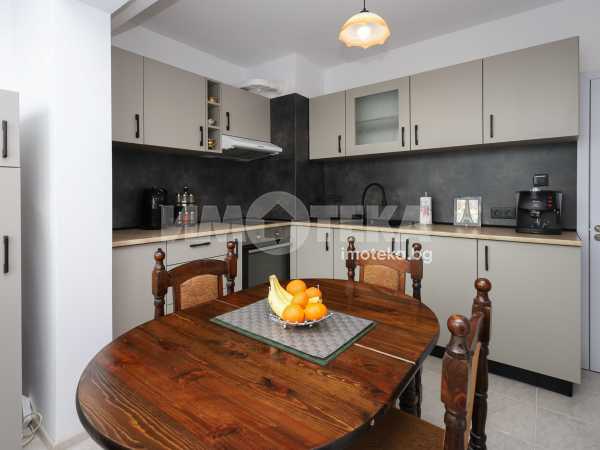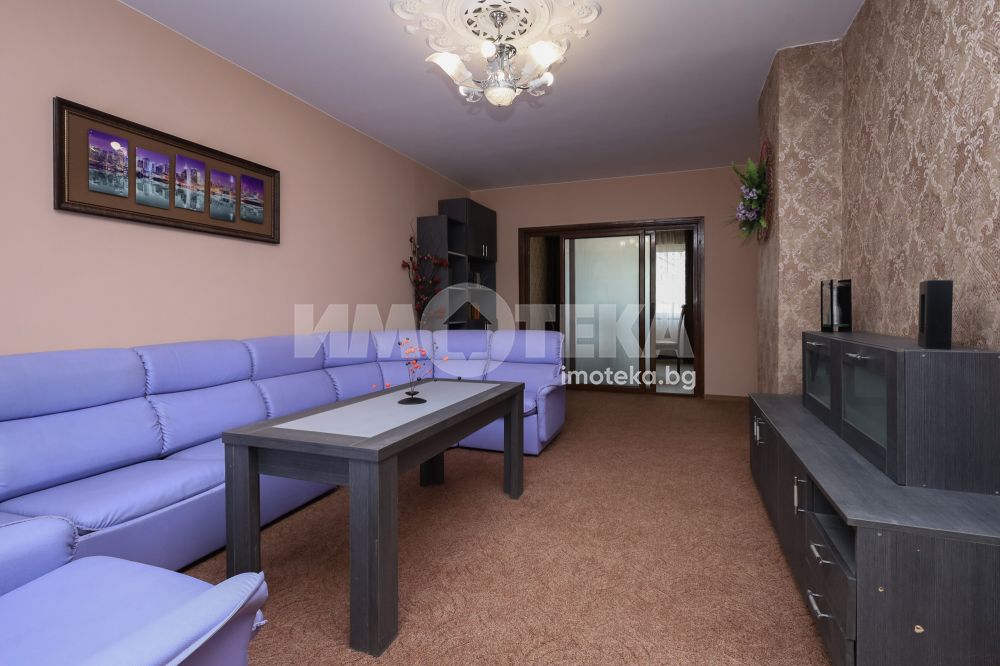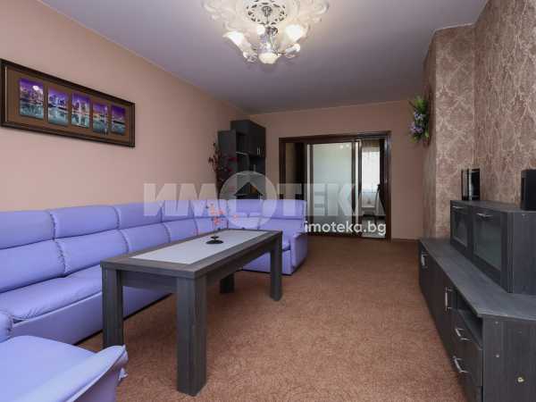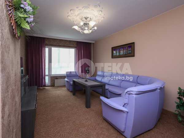 Многостаен панелен апартамент с площ 102 кв.м., състои се от пет стаи- две спални,всекидневна,кухня с усвоена тераса,трапезария, две мокри помещения,килер и остъклена тераса пред трите стаи.Жилището е на висок етаж с две изложения-югозапад и североизток.Направен е основен ремонт.