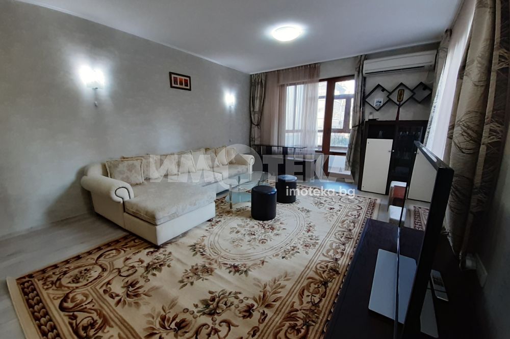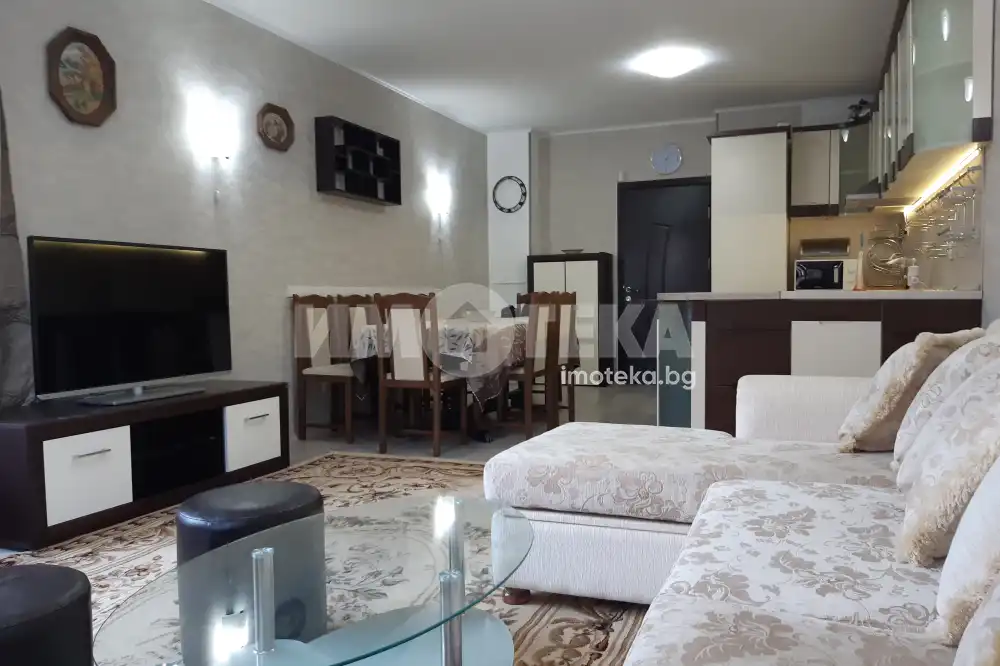 Прекрасен двустаен апартамент в жк. Лазур. Просторна всекидневна с кухня и трапезария, спалня, баня с тоалетна, мокро помещение и две остъклени тераси. Напълно обзаведен и оборудван с всички необходими домакински уреди + съдомиялна. Жилището се отоплява с климатик и радиатор.