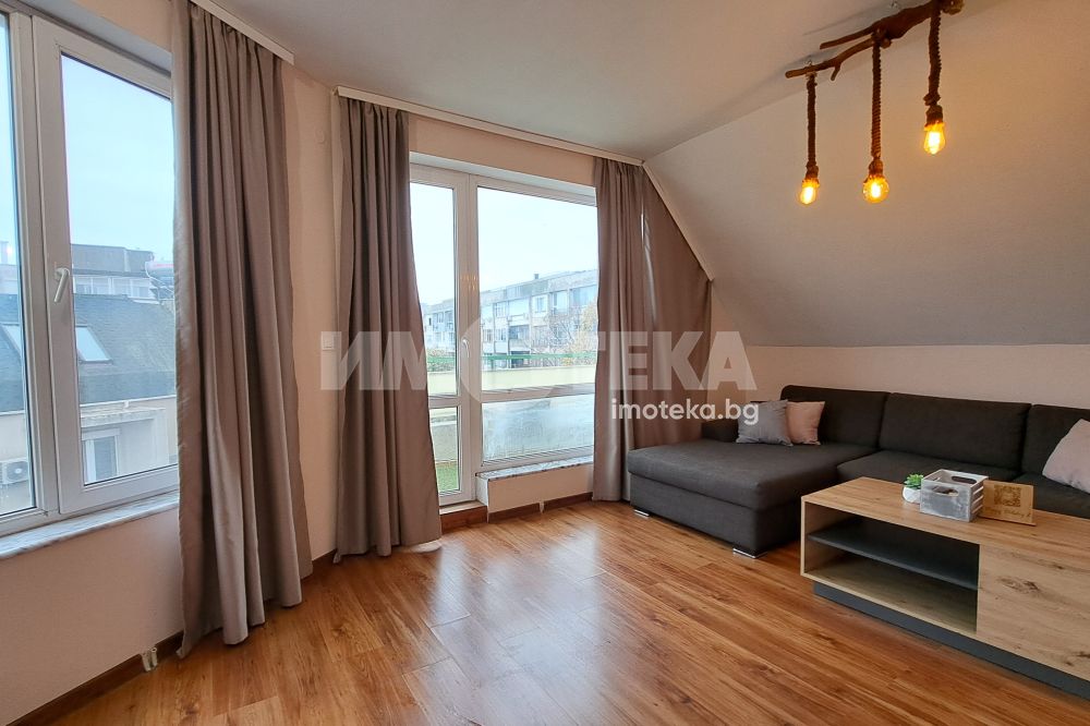 Предлагаме под наем просторен двустаен апартамент с отделна кухня, разположен на 5-ти последен етаж в тухлена сграда. Жилището е с площ 71.36 кв.м и се отдава напълно оборудвано с всичко необходимо за комфортно живеене.