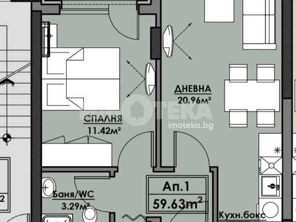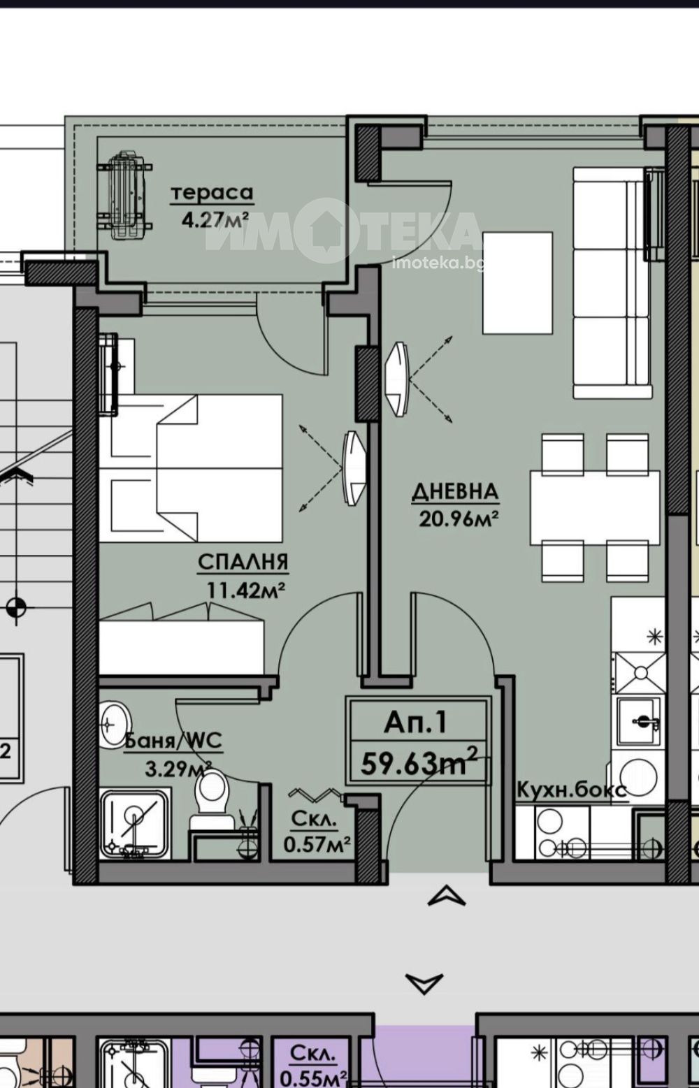 Имотът се състои от всекидневна с кухня,баня с тоалетна,коридор,склад и тераса.