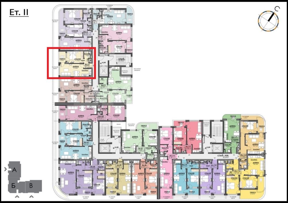 Двустаен апартамент с площ 61,313 кв. м., етаж 2 от 10, асансьор.