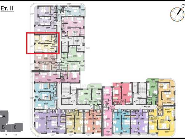 Състои се от коридор, дневна с кухненски кът и трапезария и спалня с обща тераса, баня с тоалетна и складово помещение.