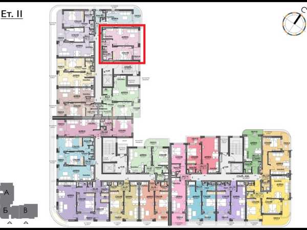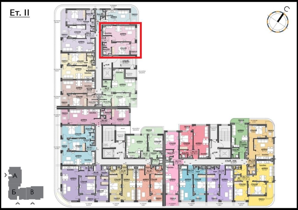 Състои се от коридор, дневна с кухненски кът и трапезария и спалня с обща тераса, баня с тоалетна и складово помещение.