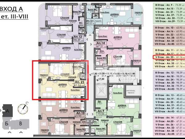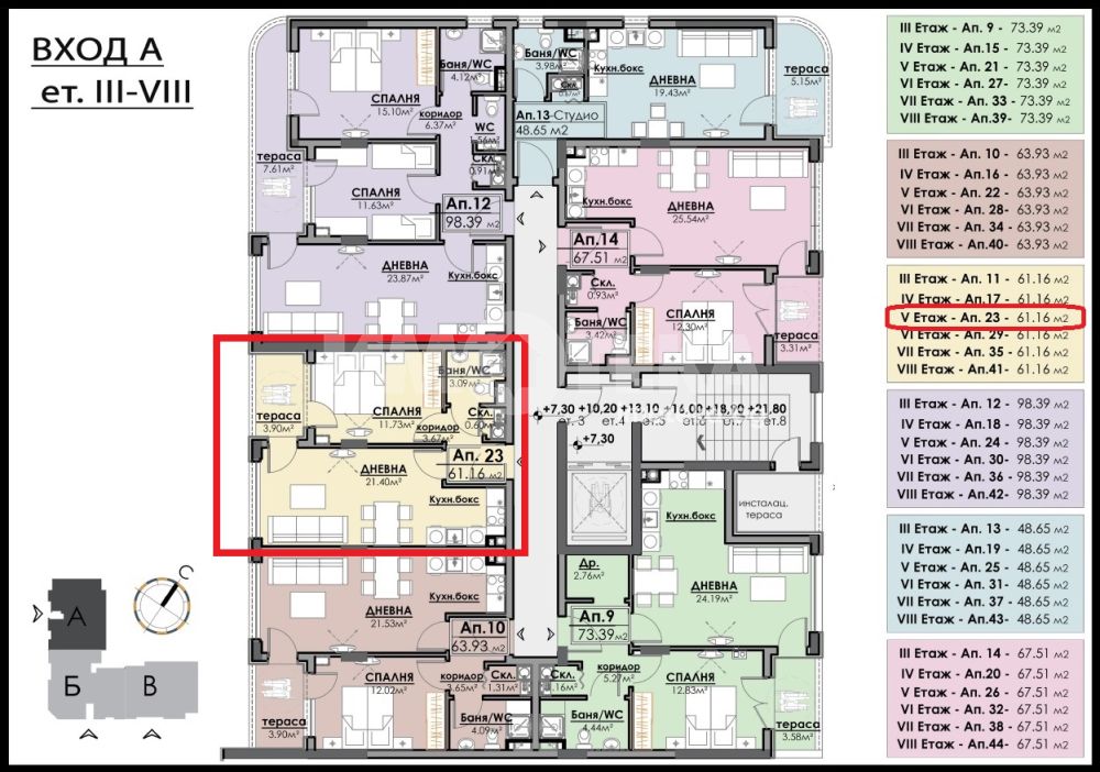 Двустаен апартамент с площ 61,16 кв. м., етаж 5 от 10, асансьор.