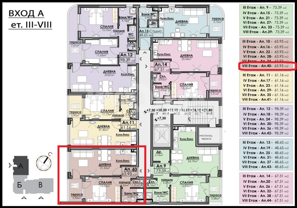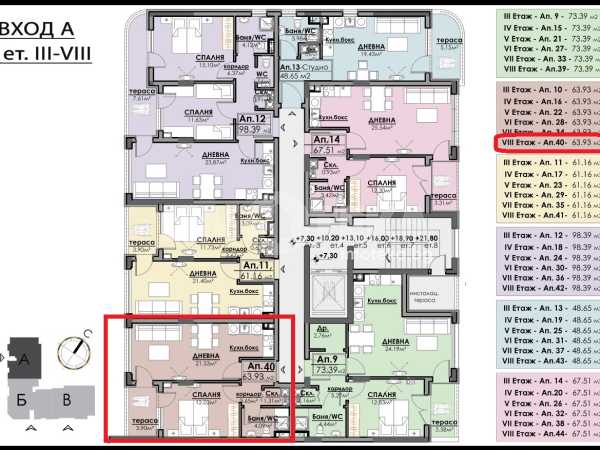 Двустаен апартамент с площ 63,93 кв. м., етаж 8 от 10, асансьор.
