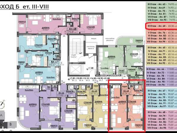 Двустаен апартамент с площ 65,36 кв. м., етаж 3 от 10, асансьор.