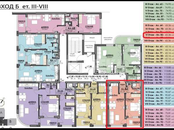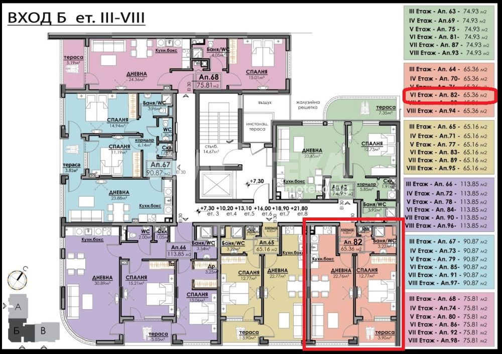 Двустаен апартамент с площ 65,36 кв. м., етаж 6 от 10, асансьор.