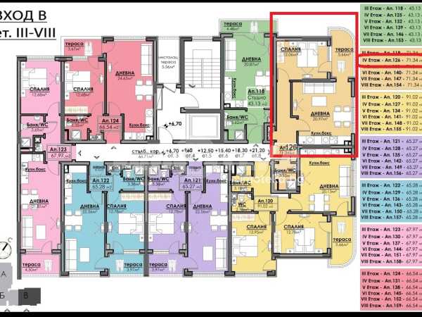 Състои се от коридор, дневна с кухненски кът и трапезария и спалня с обща тераса, баня с тоалетна.