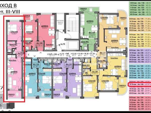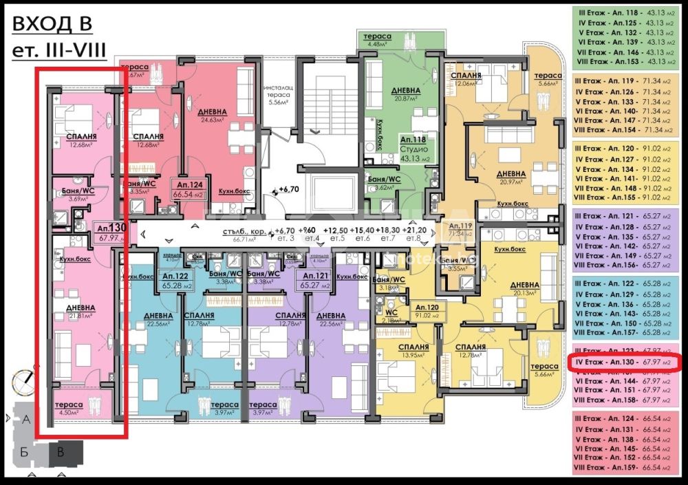 Двустаен апартамент с площ 67,97 кв. м., етаж 4 от 10, асансьор.