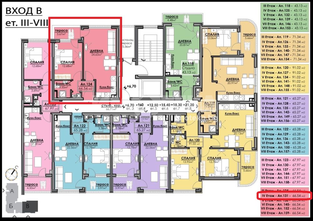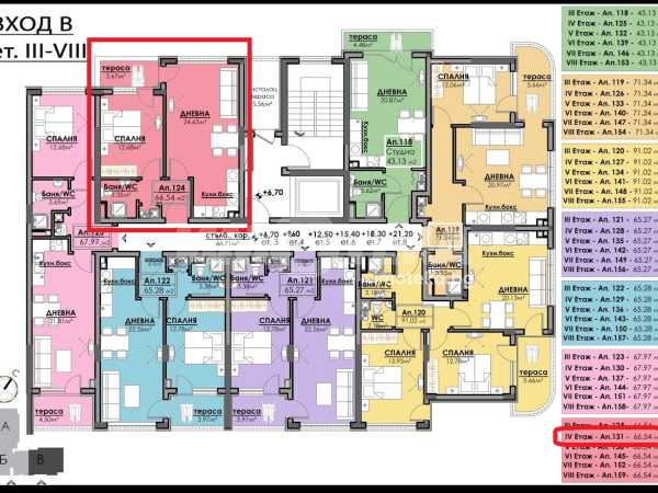 Двустаен апартамент с площ 66,54 кв. м., етаж 4 от 10, асансьор.