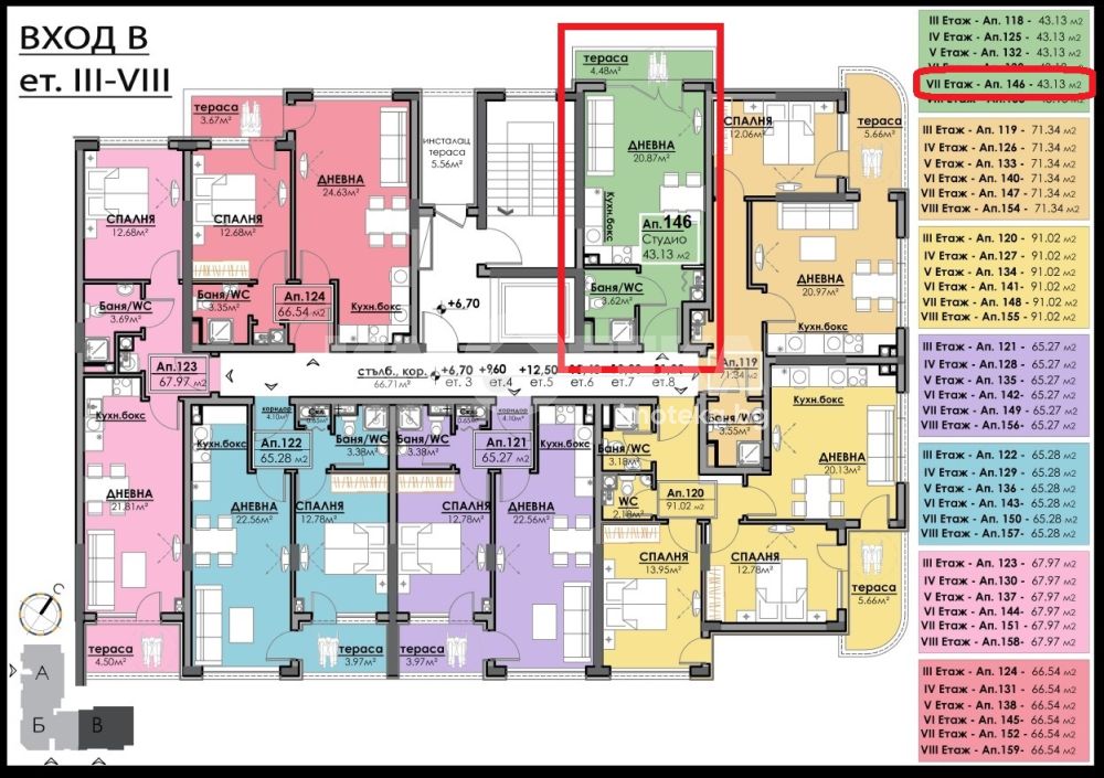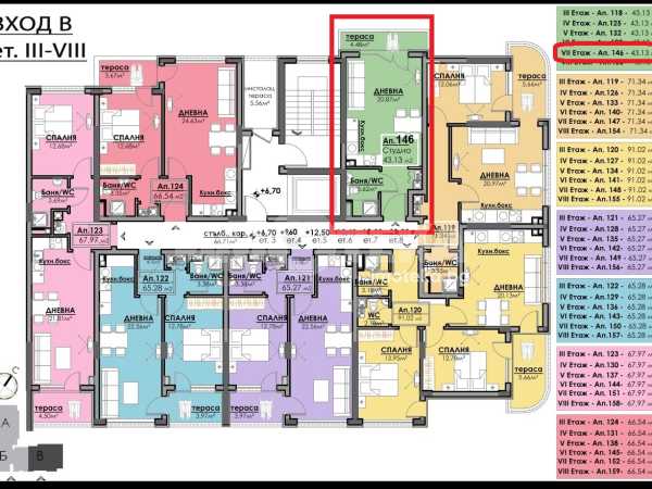 Едностаен апартамент с площ 43,13 кв. м., етаж 7 от 10, асансьор. Състои се от коридор, дневна с кухненски кът и трапезария и зона за спане, тераса и баня с тоалетна. Към имота може да се закупи паркомясто или гараж.