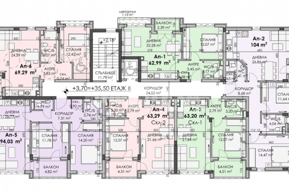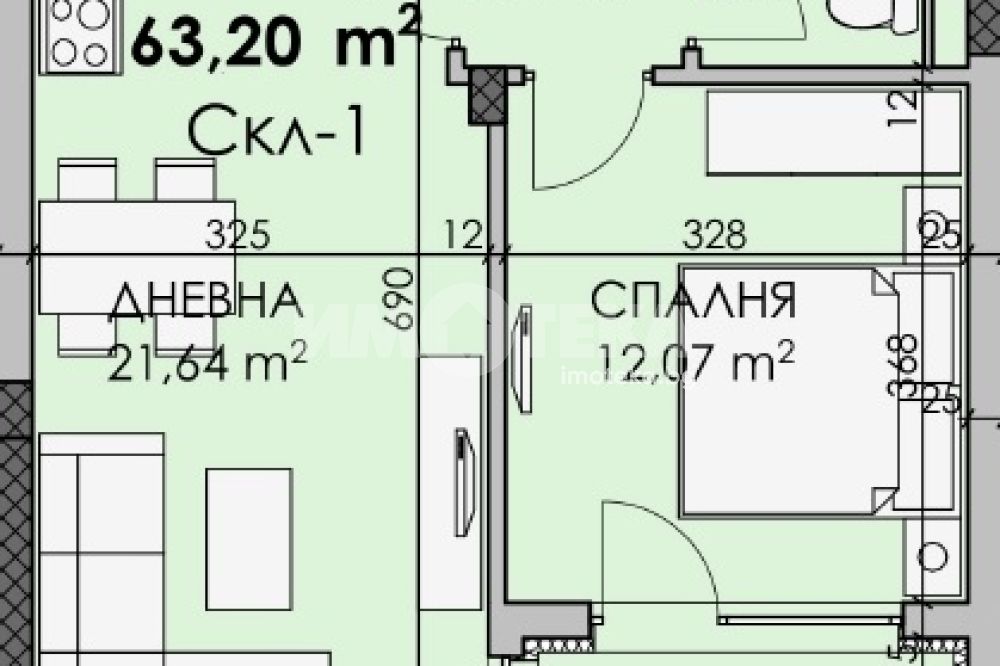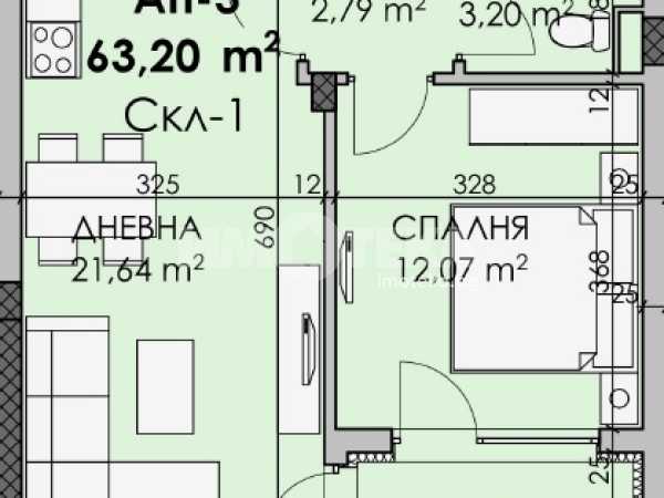 Площ на имота 63,20 кв. м., етаж 2 от 7, асансьор. Разпределение: дневна с кухненски кът и спалня с общ балкон, баня с тоалетняа и складово помещение.