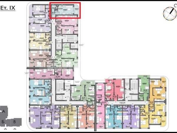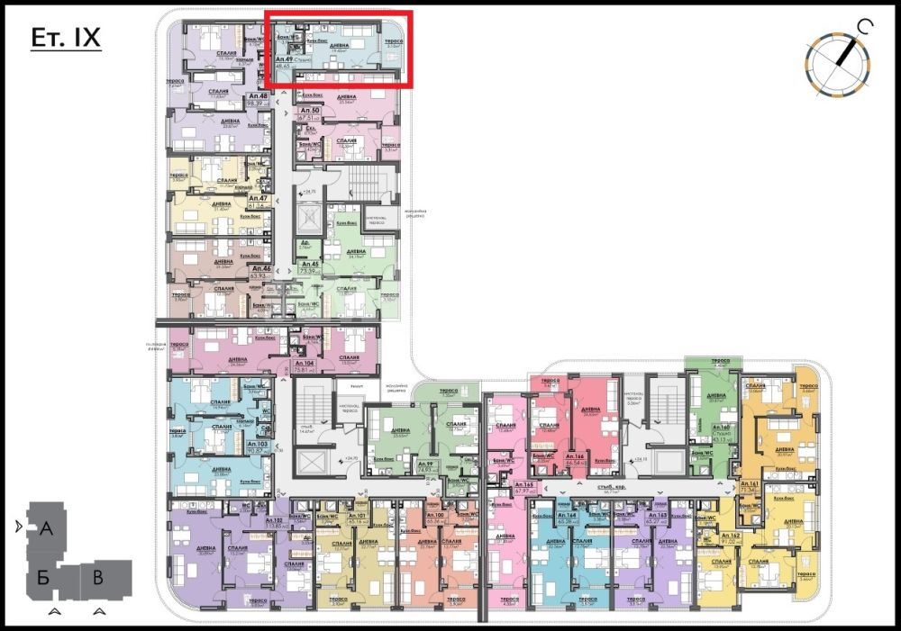 Едностаен апартамент с площ 48,65 кв. м., етаж 9 от 10, асансьор. Състои се от коридор, дневна с кухненски кът и трапезария и зона за спане, тераса и баня с тоалетна. Към имота може да се закупи паркомясто или гараж.