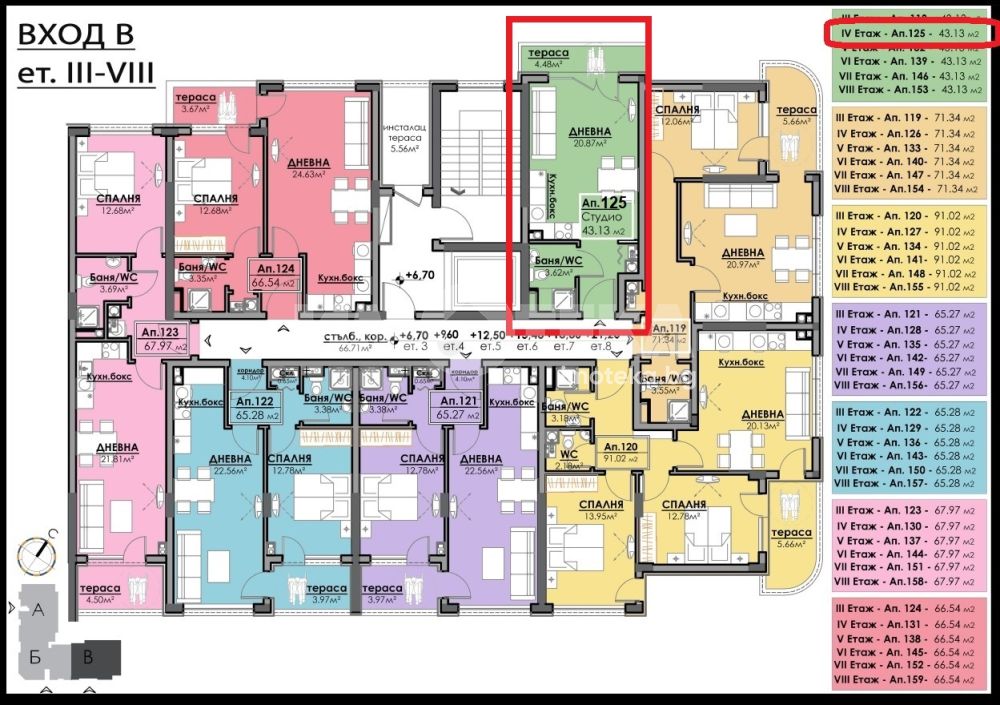 Едностаен апартамент с площ 43,13 кв. м., етаж 4 от 10, асансьор. Състои се от коридор, дневна с кухненски кът и трапезария и зона за спане, тераса и баня с тоалетна. Към имота може да се закупи паркомясто или гараж.