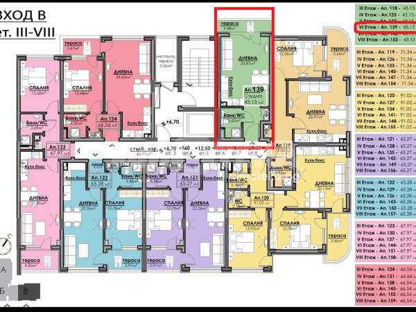 Едностаен апартамент с площ 43,13 кв. м., етаж 6 от 10, асансьор. Състои се от коридор, дневна с кухненски кът и трапезария и зона за спане, тераса и баня с тоалетна. Към имота може да се закупи паркомясто или гараж.