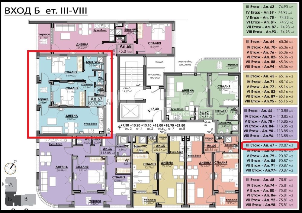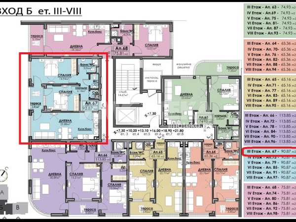 Тристаен апартамент с площ 90,87 кв. м., етаж 3 от 10, асансьор.