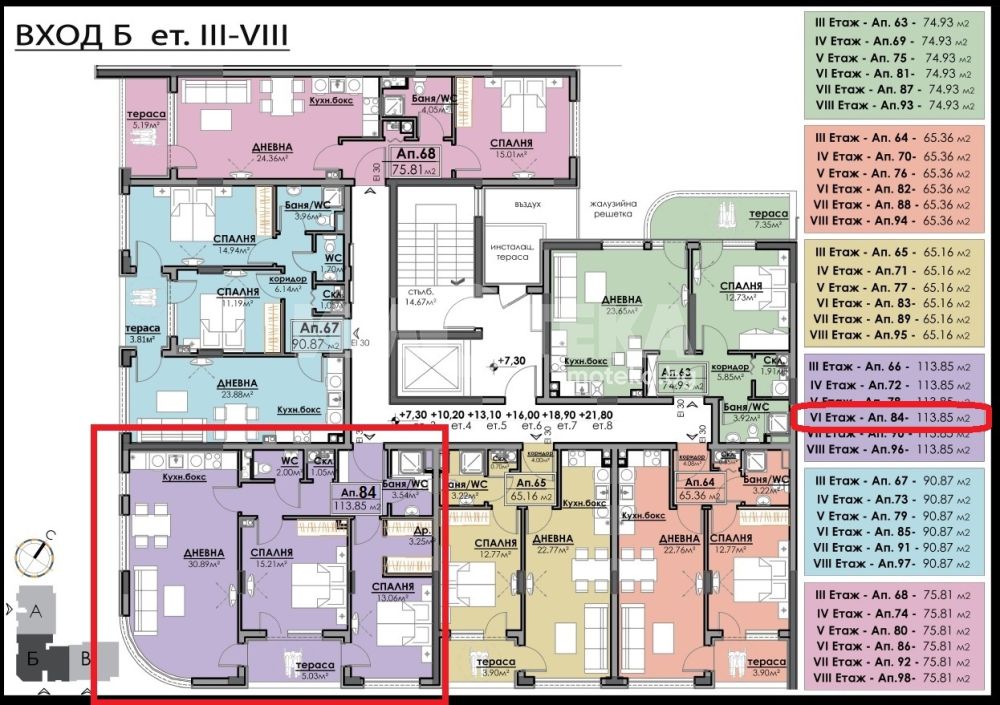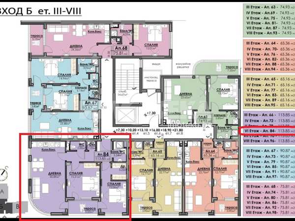 Тристаен апартамент с площ 113,85 кв. м., етаж 6 от 10, асансьор.